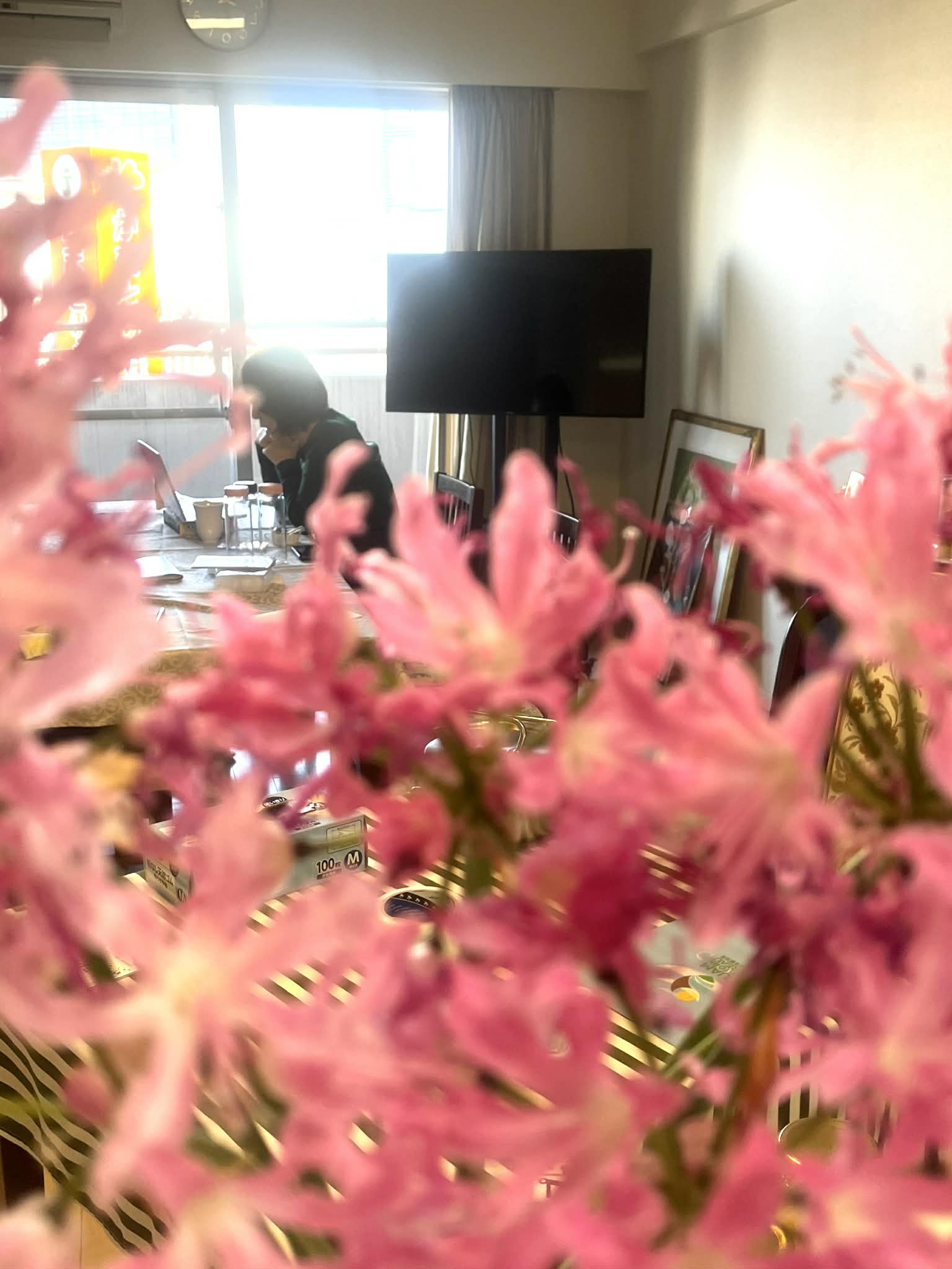 🌸ネリネ越しにパシャリ、真剣な様子です。