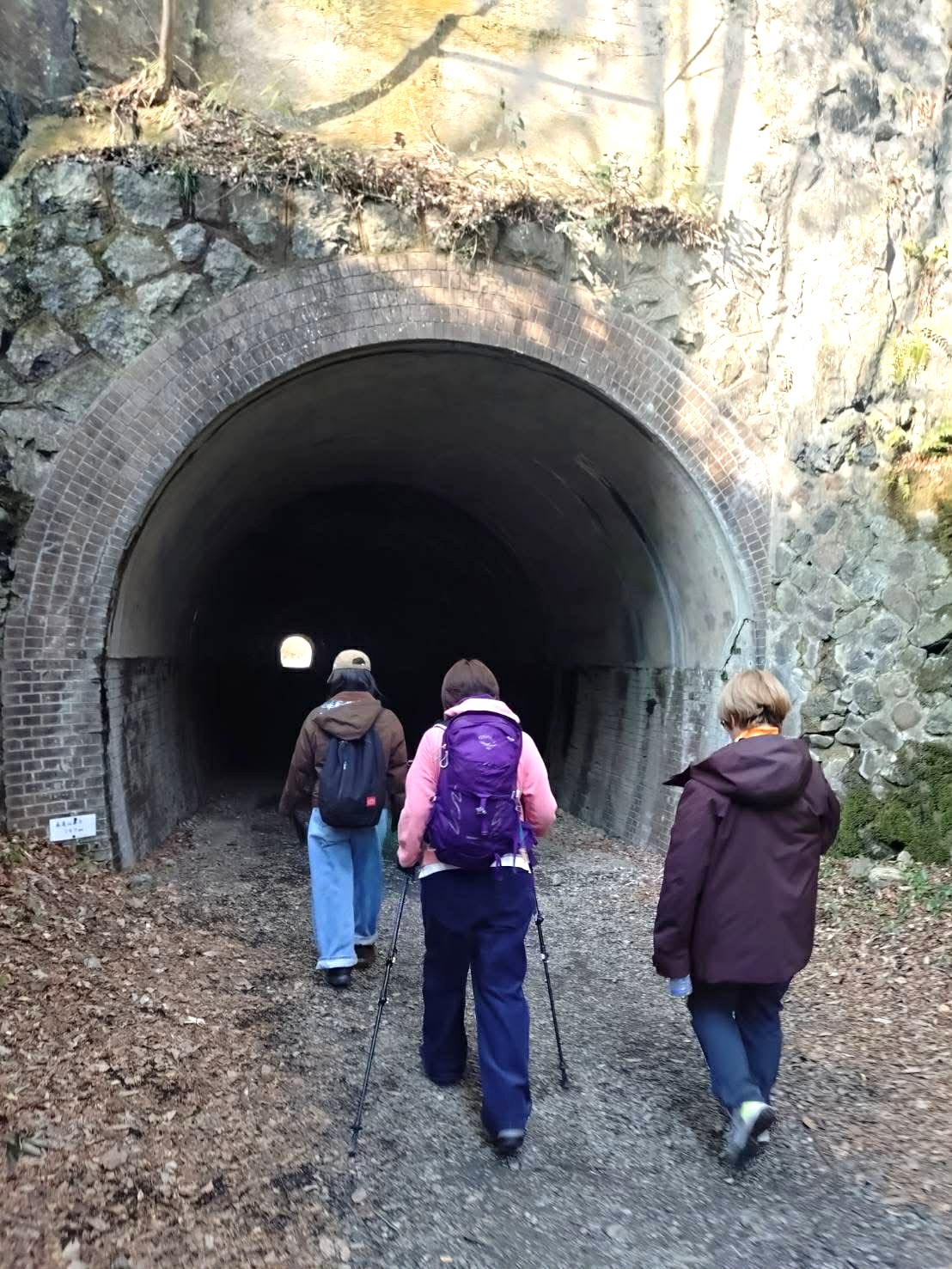 このコースは廃線跡なので、枕木の砂利道を歩き、真っ暗なトンネルがある点が特徴。